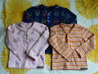 Ihan vaan peruspaitoja trikoosta. Malli taas Ottobresta, lehdestä 1/2005 Vauvan paita. Kokoina vaaleissa 86 ja tummassa 92. Pienemmät tein Lottikselle ja tuo isoin meni lahjaksi kummipojalle. Kiinnityksenä KAM-nepit. Kankaista raitainen on Amoriinista ja kaksi muuta Eurokankaasta. Nuo Eurokankaan trikoot on mukavan paksua ja jämäkkää, raitainen taas vähän lirua.