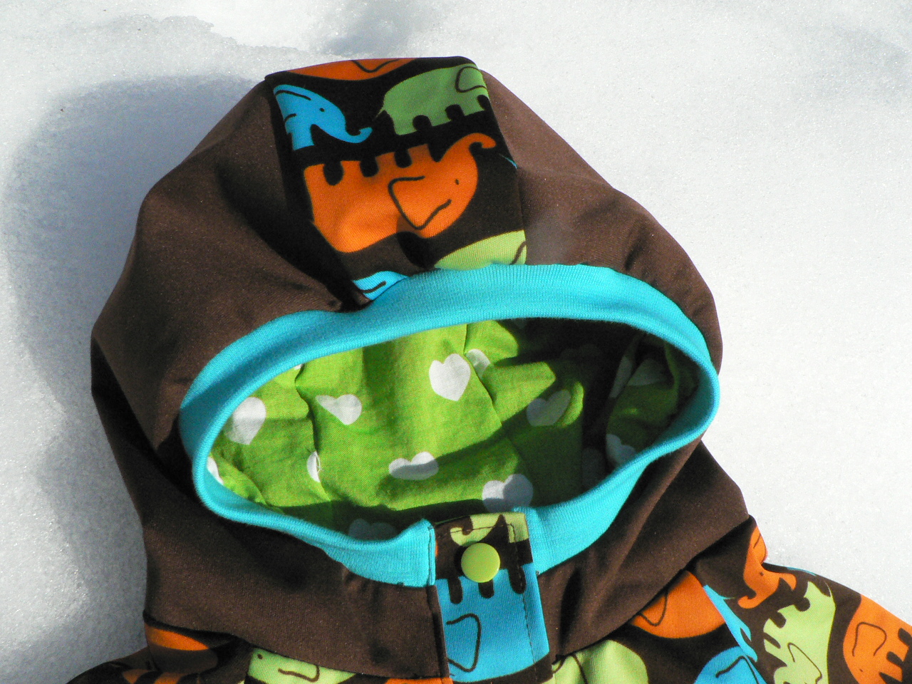 Eilen illalla sain valmiiksi kuoritakin tai anorakin tai miksi tätä nyt kutsuisikaan. Tämä on siis ihan ohut takki puuvillavuorella. Päällikankaana norsupitoista pul-kangasta jonka sain tuttavaltani. Sain häneltä ison pussillisen kestovaippakankaita vaihtamalla pariin kuosikankaaseen ja tämä ihanuus oli siinä kassissa myös. Päätin tehdä siitä takin. Kangasta kun oli täysleveä pala. Tätä ihanaa kuosia mielellään esittelee näkyvämminkin kun vain vaipoissa. :-)